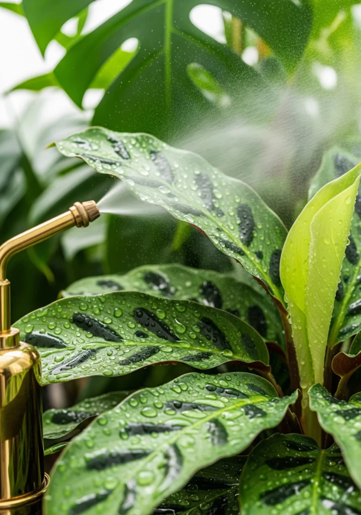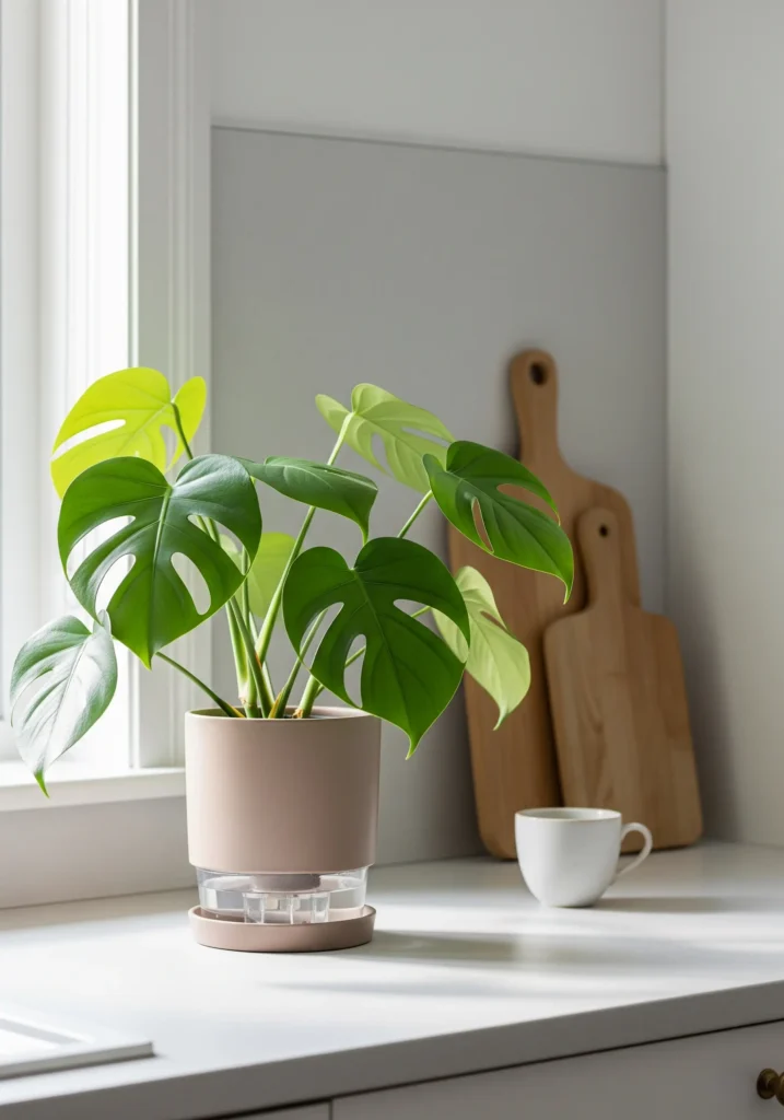 Tropical plants thrive with humidity. A decorative pebble tray placed under pots helps maintain moisture levels naturally.