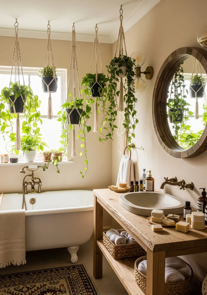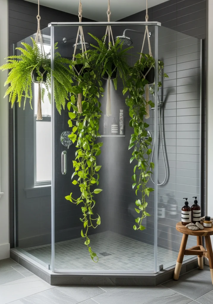 Hang trailing plants like pothos or ivy from the ceiling, shower rod, or a corner hook. It adds height and visual interest.