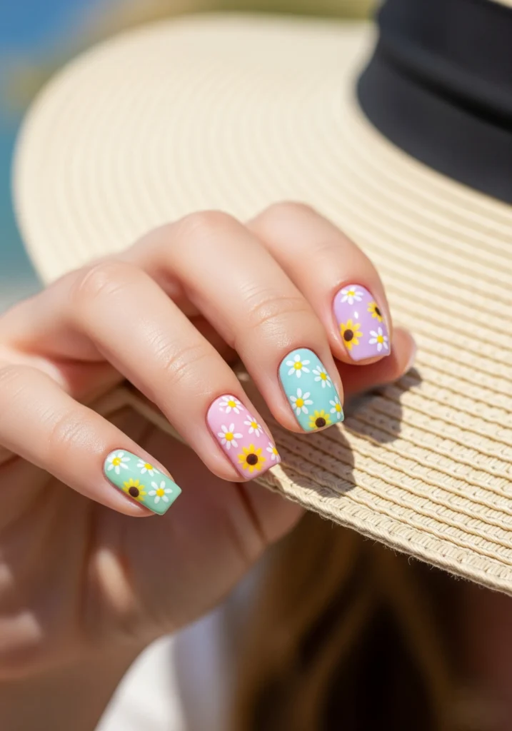 Each nail has a different design—florals, dots, glitter, and stripes combined for an eclectic summer vibe.
