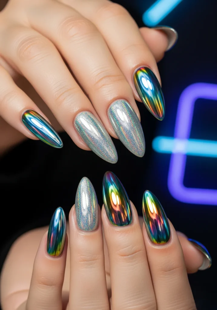 Chrome nails, holographic polish, and silver accents are everywhere, giving nails a futuristic twist.